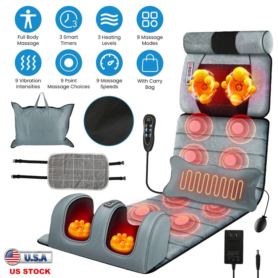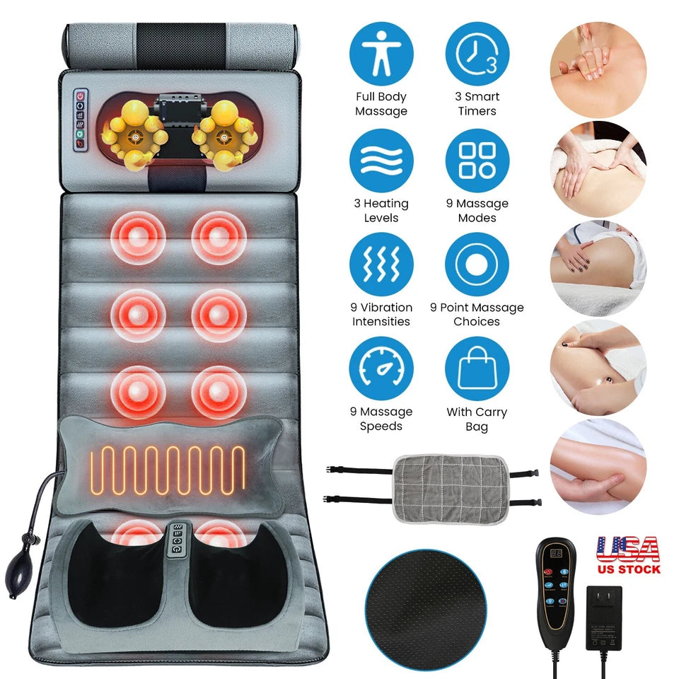 Multifunctional Massage Mat:Our full body massage mat features 10 massage points including Back,Buttock,Waist,Thigh,Calf,and heating therapy function on lumbar zones,it's able to give you a therapeutic massage that helps release tension, stress, and fatigue after a long work day. You can choose 9 designated vibration modes, 9 point-selection vibration modes, 3-level heating levels and enjoy full control over 9-level vibration intensity and 9-level speeds as you hit all the right spots.